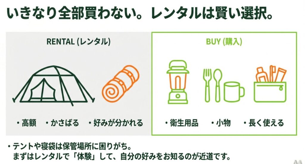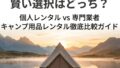 結論:最初は「高額・かさばる・相性が出る」ものほどレンタル向き。逆に、ライトや小物、衛生用品みたいな「自分仕様にしたい」ものは購入が向いてます。
