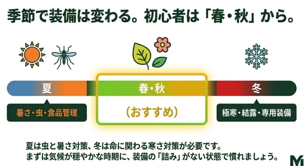 季節で装備はガラッと変わります。夏は暑さと虫、冬は寒さと結露。ここを甘く見ると、だいたい心が折れます。初心者が気持ちよく始めるなら、私は春〜秋の穏やかな時期を推します。理由はシンプルで「装備で詰む確率が低い」からです。