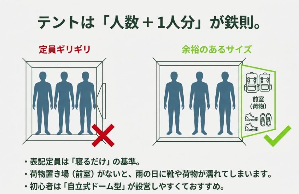 テント選びは、初心者ほどサイズと設営のしやすさで決まります。まず鉄則は「人数ちょうどを買わない」。2人なら3〜4人用、ファミリーなら荷物置きも見込んで余裕のあるサイズが快適です。表記定員は「寝るだけなら入ります」くらいの感覚なので、初めてなら余裕を見たほうがストレスが少ないですよ。