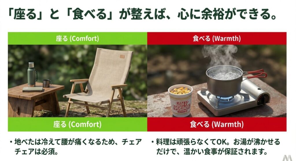| 座る | チェア/テーブル | レジャーシートで暫定対応 | 地べたで冷える、腰がやられる |