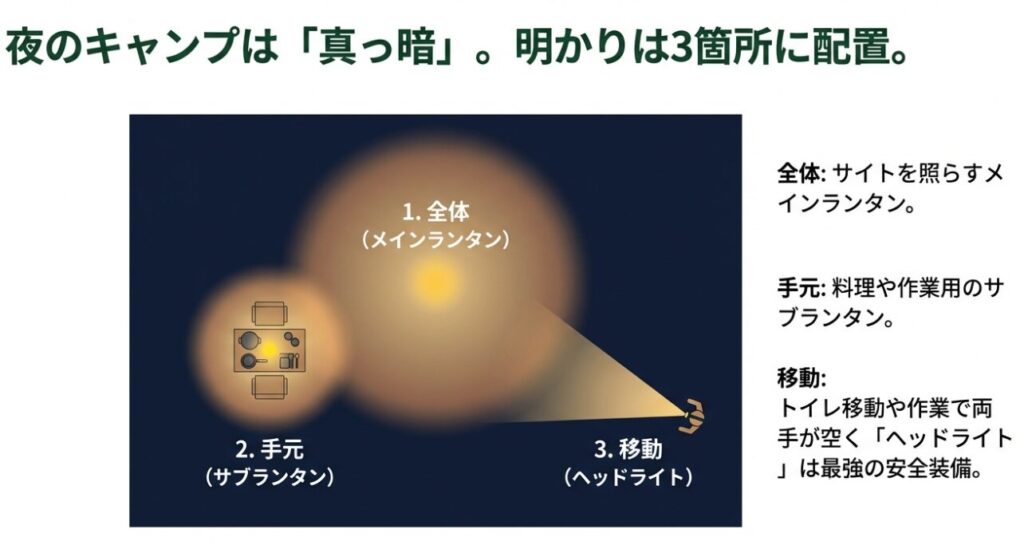 夜の安全は「明るさ」より「手が空く」こと。ヘッドライトがあると、料理・設営・子どもの対応が一気に楽になります。