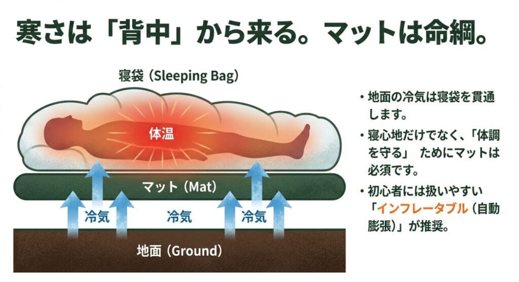 最初にお金をかけるなら、寝袋とマット。快適性というより、翌日のコンディションが変わります。