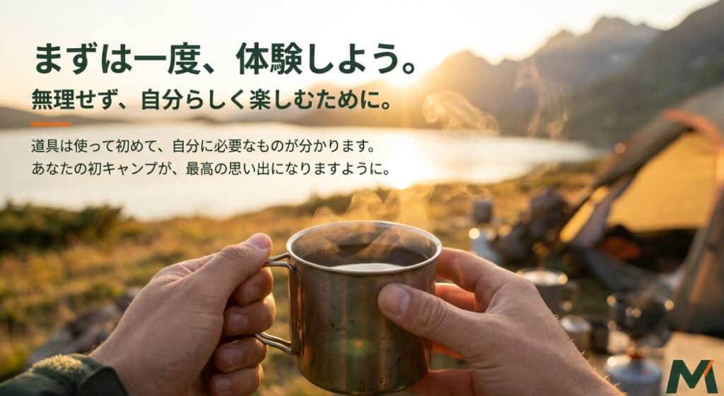 私のおすすめは、最初から全部を買い切らないこと。キャンプは趣味として相性があるので、まずは最低限で1回成功させて、必要性を感じたものから足すのがいちばん強いです。特に最初は「見た目がカッコいいから」で買うと、保管や重さで後悔することもあります。あなたの生活導線に合うか、車載できるか、乾かせるか。ここまで考えると失敗が減りますよ。