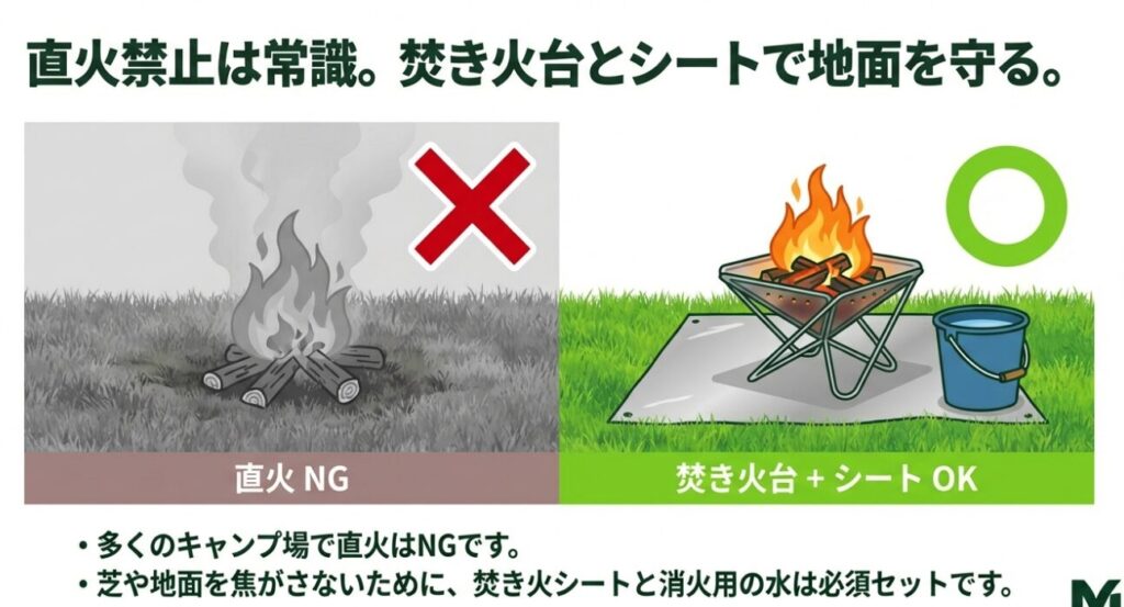 - 直火禁止が基本、焚き火台と地面保護をセットで