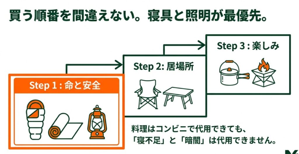 最初に揃えるなら「テント・寝袋・マット・ランタン」。この4点は快適性というより、体調と安全に直結します。ここが強いと、多少料理が簡素でも楽しいです。