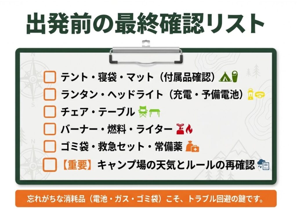 最後に、出発前チェック用にまとめます。キャンプ初心者におすすめの道具は、最初から完璧を目指すより、必需品を押さえて「失敗しない初回」を作るほうが結果的にコスパも満足度も良いです。ここまで読んだあなたなら、もう準備で迷子にならないはず。