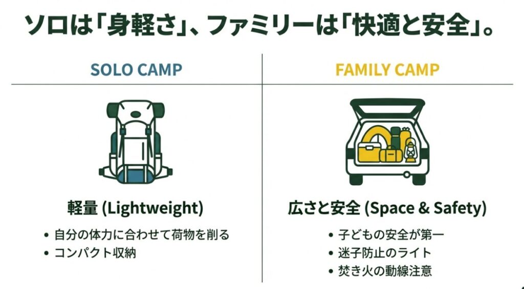 同じキャンプでも、ソロキャンプとファミリーでは「正解」が変わります。ここを最初に理解しておくと、買い物で遠回りしません。ソロは自由度が高いけど、全部を一人で運んで設営して片付けます。ファミリーは荷物が増えるけど、快適にすると全員が笑顔になりやすい。つまり「目的」が違うんですよね。