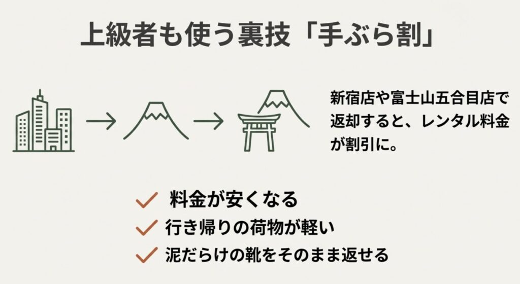 具体的には、「新宿店で事前にレンタル品を受け取り、登山後に新宿店(または富士山五合目などの指定店舗)へ直接返却する」といった利用方法を選ぶと、レンタル料金が割引(例:1,000円OFFや10%OFFなど)になる制度です。配送コストがかからない分を利用者に還元してくれるわけですね。