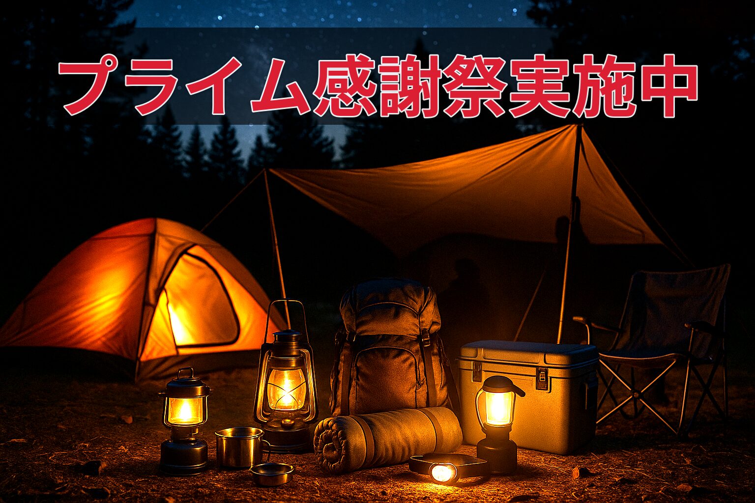 上記はプライム感謝祭の先行セール期間中、キャンプ・防災関連の会場内に掲載されることがある類似カテゴリの例です。表示・在庫・価格は時期や条件で変動するため、商品ページのセール表記と納期、保証条件を都度確認してください。