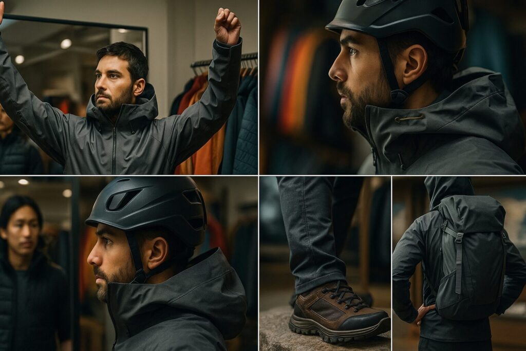 腕上げや前かがみで突っ張りが出ないか、フードで視界が遮られないか、重ね着しても動きやすいかを試着で確かめます
