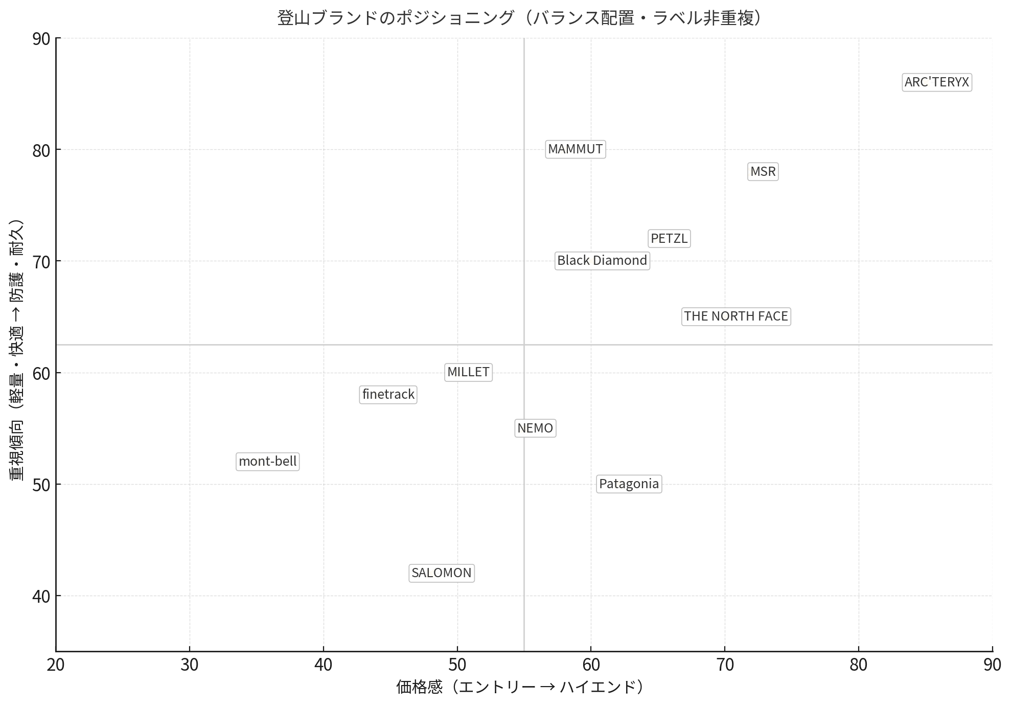 数値の使い方の目安として、Yが高いブランドは厳しい天候や長期山行で安心感を得やすく、Xが高いブランドは新素材や精緻な設計による快適性を狙う際に選びやすくなります。逆にXが低めのブランドは価格対効果を意識した装備入門に向いています。Yが低めでも「悪い」のではなく、軽快さや価格対効果、汎用性を優先した設計が多い傾向があります。サイズ相性や修理体制は最終判断の重みを上げると納得のいく選択につながります。