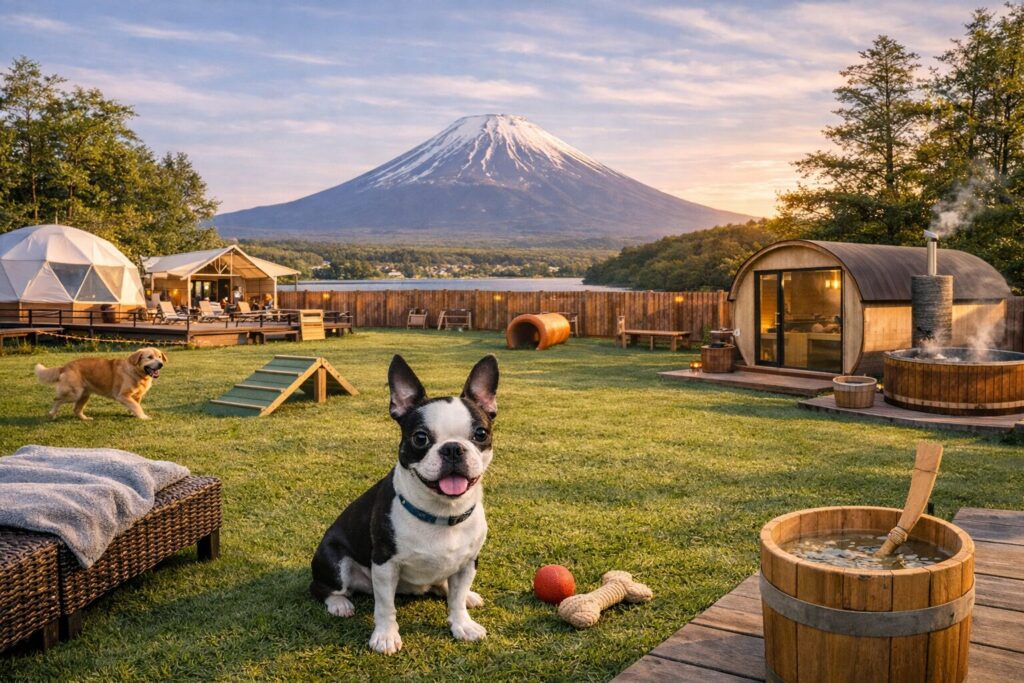 山梨エリアには、そんな悩みを吹き飛ばしてくれる素晴らしい施設があります。例えば、山中湖の「グランピングヴィレッジTOTONOI」です。ここには、最大150平米という圧倒的な広さのプライベートドッグランを備えた客室があります。150平米といえば、一般的なテニスコートの半分以上の広さです。これなら大型犬でも思いっきり走り回れますよね。