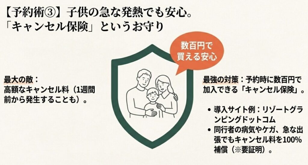 - 予約時は「キャンセル保険」に加入し、急なトラブルに備える。